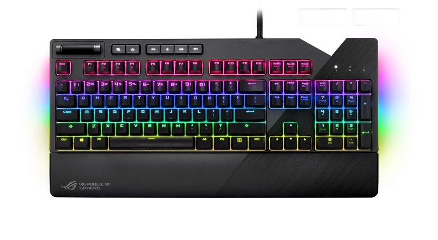 RGB mechanical gaming keyboard with Cherry MX switches, customizable illuminated badge and dedicated media keys for gaming